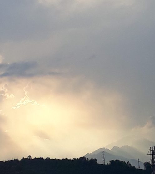 Sunrise, 30 December 2020 Now is the hour of the small birds storming into the cypress tops, which do not bend as they do under the weight of magpies and ravens. A murmuration of morning steam rises off the cement factory. Disguised as fast-moving clouds, they power up the valley; an insubstantial mother tugging at the hand of her sleepy puff of a child, running off into nothing. Now the sun snaps across the mountains an incandescent ribbon of rose-lipped pink. Clouds, scattered across the measureless pale-blue tile of sky, explode into tulip petals, pink swans, holy doves alight.