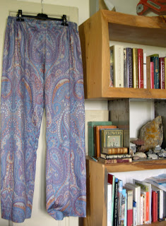 I have been sewing like mad lately. I finally finished the pants pictured at left and I’m wearing them! They’re really comfortable and great for hot days when one’s legs are not ‘summer perfect’. Made in cotton sateen, they’re a cinch to iron after hanging up to dry.